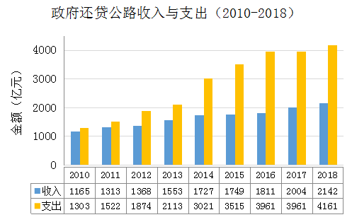 2018年度,全国收费公路收支平衡结果为-4069.4亿元,比上年增加42.9亿元,增长1.1%。但收支缺口仍然巨大。2010年至2018年度,收支平衡结果依次为:32.5亿元、-323.3亿元、-565.7亿元、-660.5亿元、-1571.1亿元、-3187.3亿元、-4143.3亿元、-4026.5亿元和-4069.4亿元。