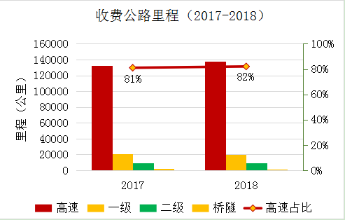 2018年末,全国收费公路里程16.81万公里,占公路总里程484.65万公里的3.5%。其中,高速公路13.79万公里,一级公路1.96万公里,二级公路0.97万公里,独立桥梁及隧道951公里,占比分别为82.0%、11.7%、5.7%和0.6%。
